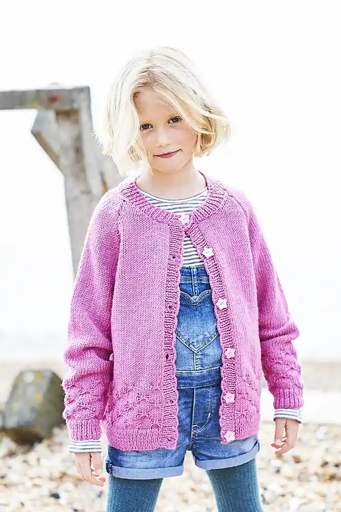 Sometimes the easiest thing is to throw on a cardigan and run out to play. These little girl’s cardigans with a texture stitch around the hem can be knitted as a round or v neck.