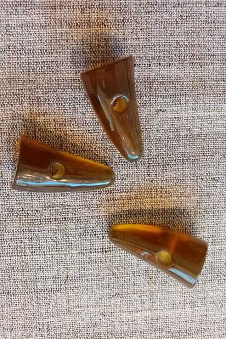 Semi-transparent amber horn toggles with one hole. Plastic with a slight texture, 35mm in length. Perfect for knitwear and coats.