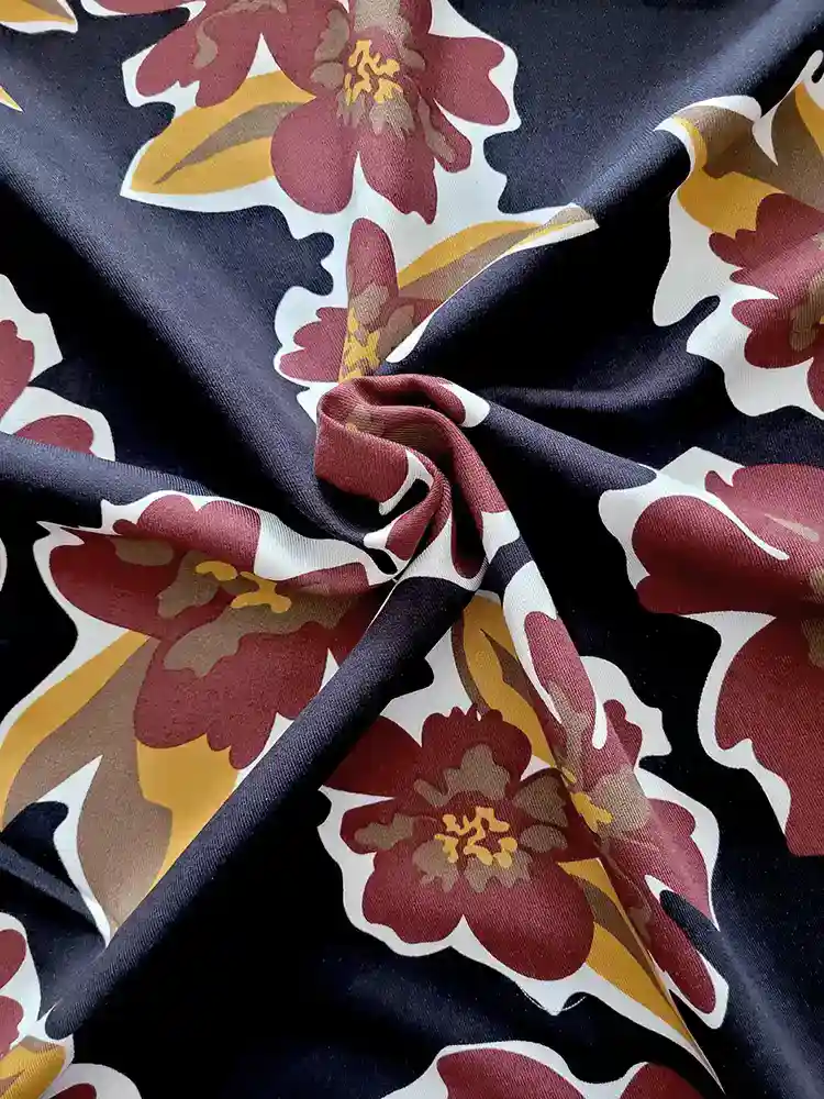 Bold russet/ochre floral viscose print on a very dark (almost black) midnight blue background. 100% viscose. 147cm wide. Always pre-wash strong colours. Tumble dry not recommended. Email us for a sample.