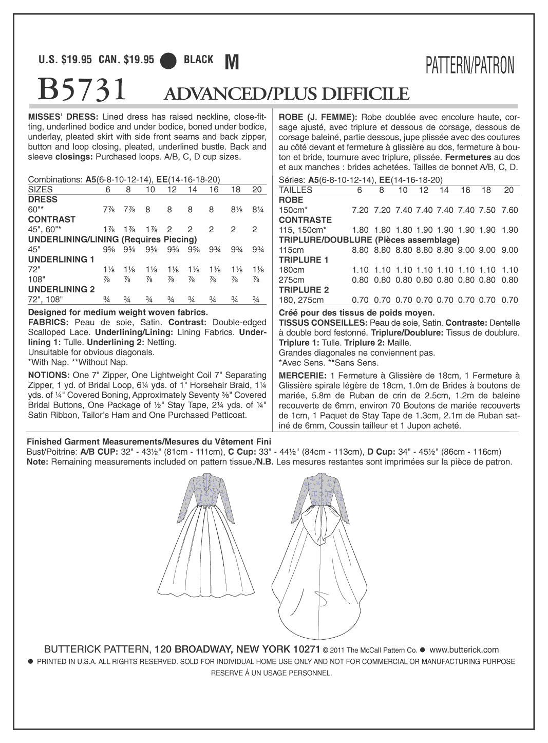 B5731 Misses’ Dress. Lined dress has raised neckline, close-fitting, underlined bodice and under bodice, boned under bodice, underlay, pleated skirt with side front seams and back zipper, button/loop closing and pleated, underlined bustle. Back and sleeve closings: purchased loops. A/B,C,D Cup sizes. Includes separate pattern pieces for A/B, C and D cup sizes.