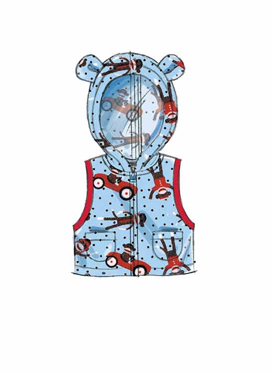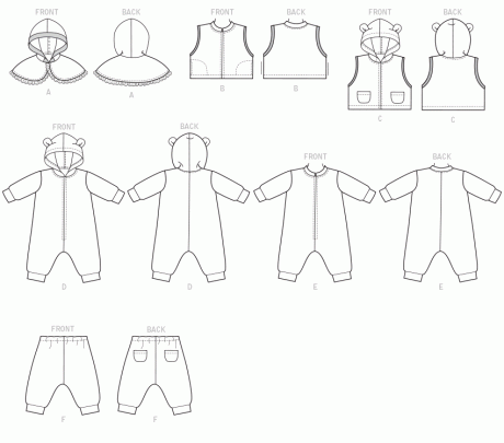 Cape has hood with contrast band, snap closing, and pre-gathered lace trim. Vest has front zipper closing and purchased bias binding on armholes. Bunting has front zipper closing. C,D: hood with ears. Pants are pull-on with elasticised waist. Fabrics: fleece. Unsuitable for obvious diagonals.
