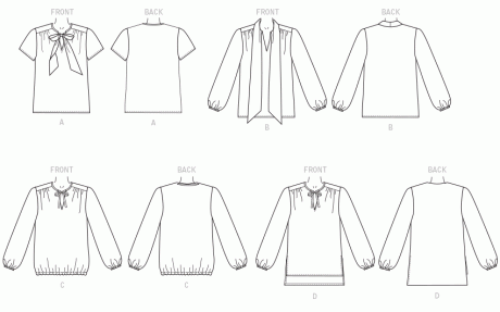 Pullover top and tunic have front yoke with gathers, V-neck with tie options, sleeve and hemline variations. Fabrics: georgette, challis, crepe, rayon. Unsuitable for obvious diagonals.
