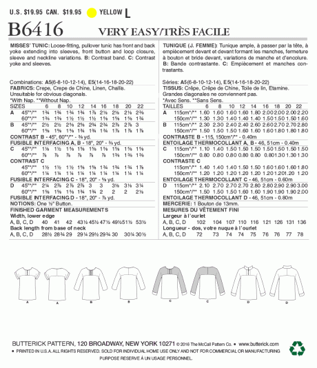B6416 Misses’ Button-Closure Tunics with Yokes. Loose-fitting pullover tunic has front and back yoke extending into sleeves, front button and loop closure, sleeve and neckline variations. B: Contrast band. C: Contrast yoke and sleeves.