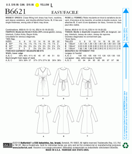 Close-fitting knit dress has front, neckline and sleeve variations and double-stitched hems. B, C ties are single thickness; wrong side of fabric may show. Fabrics: Moderate Stretch Knits (35% Cross Grain): Jersey Interlock, Cotton Knits, Rayon Knits. Discontinued pattern, sizes 14-16-18-20-22 only