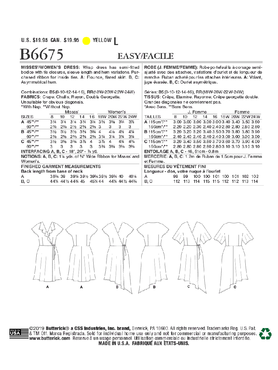 Discontinued pattern. Size range 18W-20W-22W-24W only. Cannot be reordered. B6675 Misses’/Women’s Dress. Wrap dress has semi-fitted bodice with tie closures, sleeve length and hem variations. Purchased ribbon for inside ties. A: Flounce, flared skirt. B, C: Asymmetrical hem.