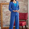 Misses’ and women’s one button front jacket has 3/4 sleeves with gathers. Pull-on faux wrap skirt and wide leg pants have elasticized waist.