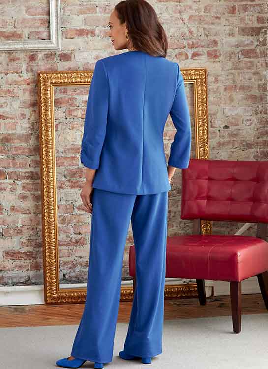 Misses’ and women’s one button front jacket has 3/4 sleeves with gathers. Pull-on faux wrap skirt and wide leg pants have elasticized waist.. FABRICS: Ponte, French Terry, Sweatshirt Fleece.