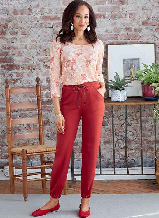 Misses’ pull-on pants with elasticized waist, pockets and hem variations.