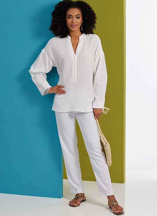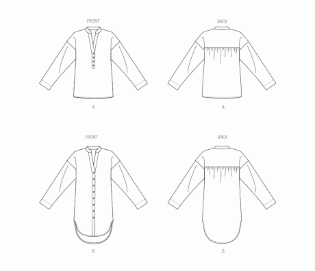 Very loose-fitting top or tunic has dropped shoulders, long sleeves, neck band, front button closure, and length and hemline variations. View A has front placket. View B has front band and shaped high low hem. Sewing difficulty: Average.