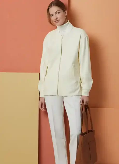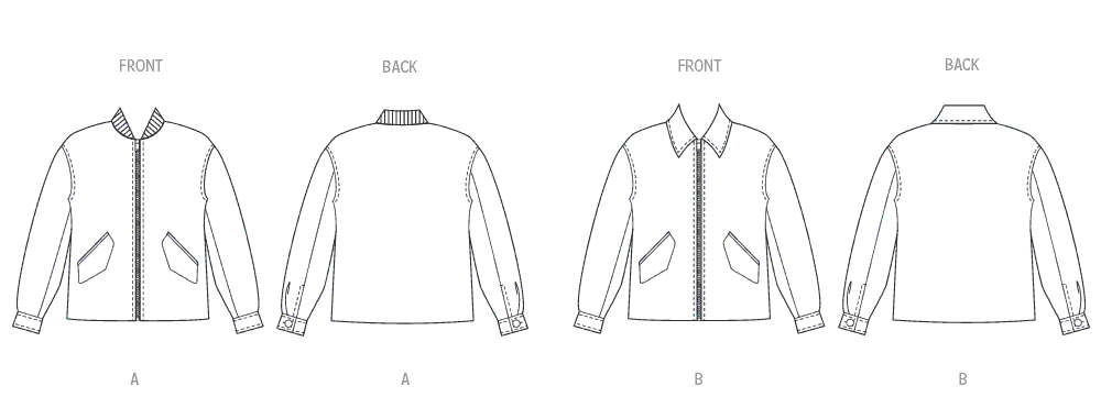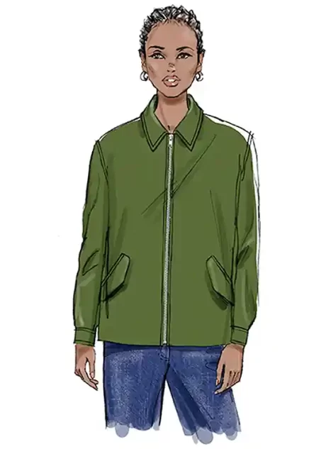Very loose-fitting, lined bomber jackets with collar variations have dropped shoulders, front zipper closure, welt pockets with flaps and long two-piece sleeves with buttoned cuffs. Fabric suggestion: Denim, Gabardine, Medium weight Wool Blends, Synthetic Suede. Lining: Lining Fabric. Interfacing: Lightweight Fusible. Sewing level: Average