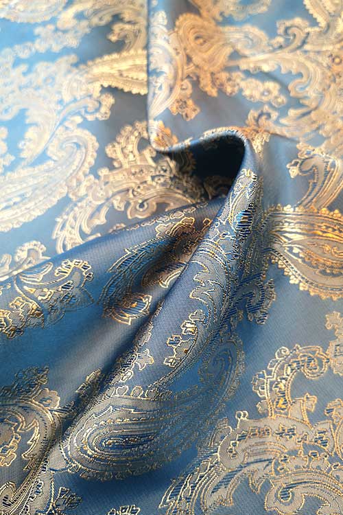 New colours added. Fancy two-tone paisley jacquard lining fabric. 54%polyester, 46% viscose. Available in turquoise/gold, red/navy, gold/wine and red/bronze, purple/gold, red, gold/beige, gold, and rust/gold, blue/bronze, gunmetal, and ivory. Fully double-sided weave, with negative colourway on reverse. 142cm wide, 90 gsm.