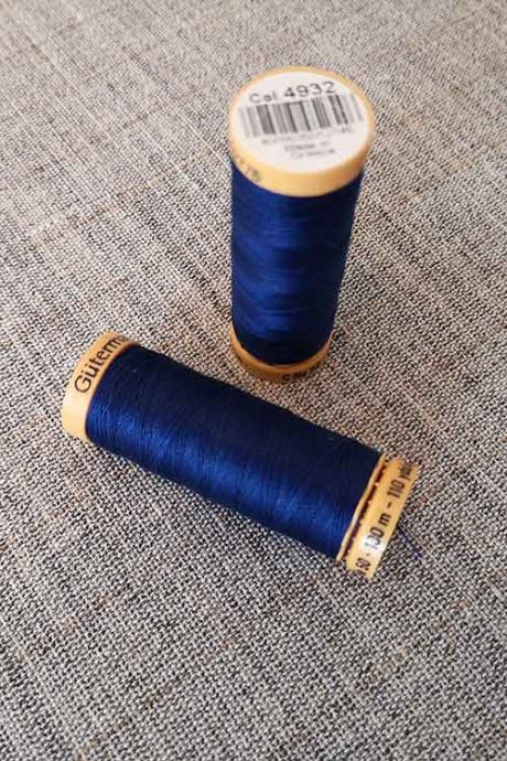 Blue (#4932) Gutermann cotton thread. Gutermann Creativ 100% mercerised cotton threads are the all-rounders among natural threads. They are exceptionally strong and have a naturally lustrous appearance. The softness of the natural thread allows for a smooth and even seam.