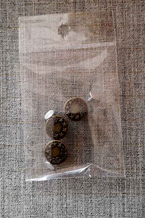 Non-sew quality brass jeans buttons with decorative tops. Just push the pin through the fabric and hammer the button on top! Bronze – 16mm, 5/8in. 3 sets.