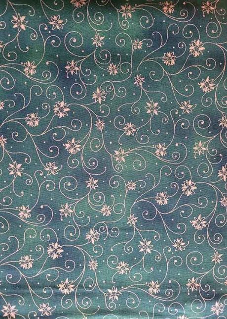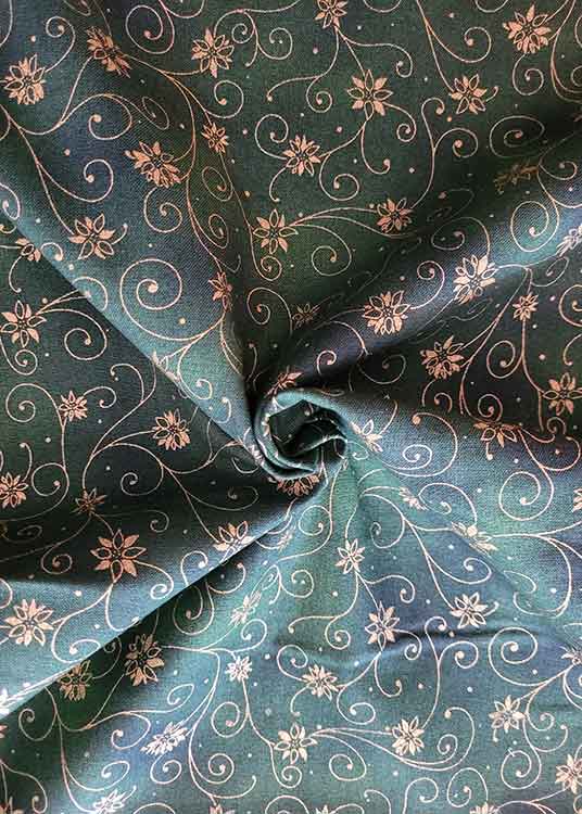 Elegant floral shapes joined with graceful curls, gold print on green ‘nebula’ background from John Loudens fantastic festive range of 110cms wide 100% Cotton Christmas Cotton Prints. Lots of designs for all tastes and applications. For your gift and home décor ideas.