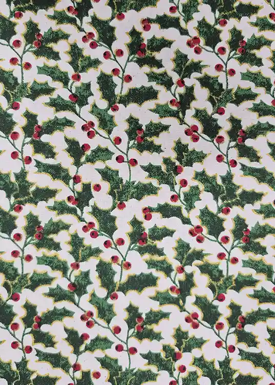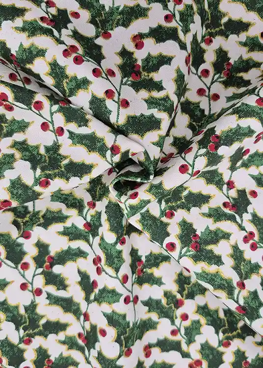 Holly berries with glittery gold edged leaves on an ivory background from John Louden’s fantastic festive range of 110cms wide 100% Cotton Christmas Cotton Prints. Lots of designs for all tastes and applications. For your gift and home décor ideas.