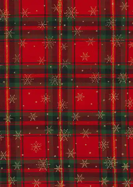 John Louden 100% Cotton Christmas Cotton Print. Gold snowflakes on a green and red plaid background. Fabric for all your Christmas gift and home decor ideas: merry and bright, modern, or classic. 140gsm. 110cm wide.