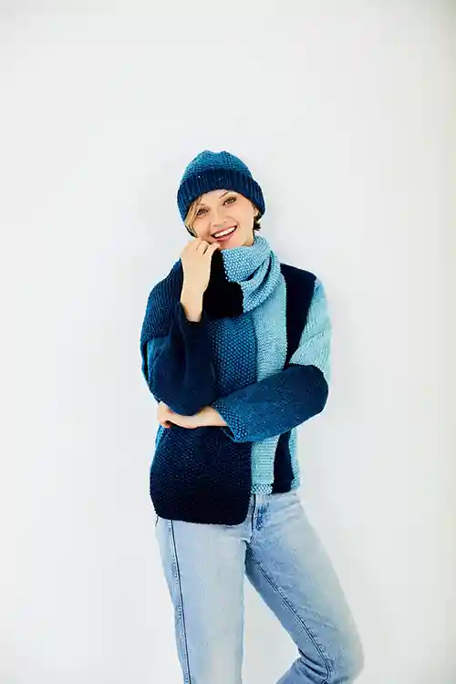 Ladies’ Sweater, Hat & Scarf designed for Horizon Chunky yarn. Meet our brand-new obsession: Horizon Gradient Yarn! Each oversized 200g cake is a work of art, featuring a perfectly balanced, single pattern repeat that melts from rich, deep tones to the softest, lightest tints. The result? Gorgeous, dip-dyed effects that make every project look effortlessly stunning. This luxurious acrylic-wool blend isn’t just beautiful it’s practical too. The generous cake format shows off every shade in the gradient, so you know exactly what magic is waiting inside. Horizon is the yarn that will transform your makes into masterpieces.