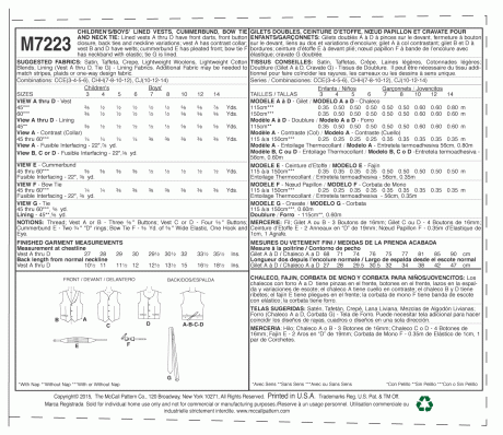 Lined vests A thru D have front darts, front button closure, back ties and neckline variations. Vest A has contrast collar. Vest B and D have welts. Cummerbund E has pleated front. Bow tie F has neckband with elastic. Tie G is lined. Satin, Taffeta, Crepe, Lightweight Woolens, Lightweight Cotton Blends. Lining (Vest A thru D, Tie G) – Lining Fabrics.