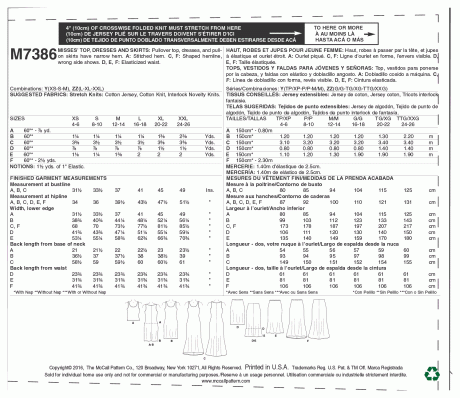 Pullover top, dresses and pull-on skirts have narrow hem. A: Stitched hem. A, B, C: Sleeveless and scoop neckline. C, F: Shaped hemline (wrong side shows). D, E, F: Elasticized waist.