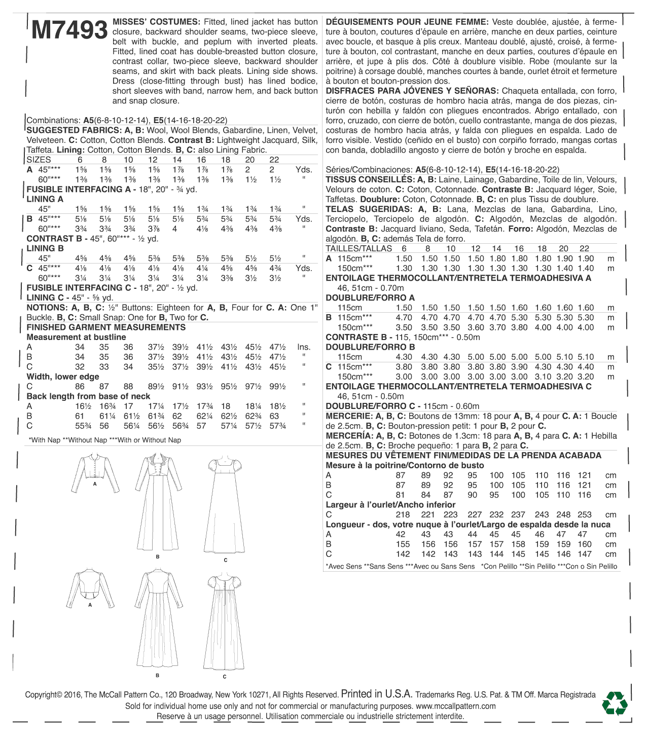 Fitted, lined jacket has button closure, backward shoulder seams, two-piece sleeve, belt with buckle, and peplum with inverted pleats. Fitted, lined coat has double-breasted button closure, contrast collar, two-piece sleeve, backward shoulder seams, and skirt with back pleats. Lining side shows. Dress (close-fitting through bust) has lined bodice, short sleeves with band, narrow hem, and back button and snap closure. A, B: Wool/Wool Blends, Gabardine, Linen, Velvet/Velveteen. C: Cotton/Cotton Blends. Contrast B: Lightweight Jacquard, Silk, Taffeta. Lining: Cotton/Cotton Blends. Also B, C: Lining Fabric. Easy