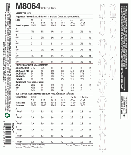 Pullover dress, fitted through bust, have neckline, sleeve and hem variations. A, F: Sleeveless. B: Three-quarter length sleeves. C: Long sleeves. D, E: Short sleeves. A, B: V-neckline. C, D: Crew neckline. E, F: Scoop neckline. Fabrics: Moderate stretch knits: Interlock, Cotton Jerseys, Cotton Knit.