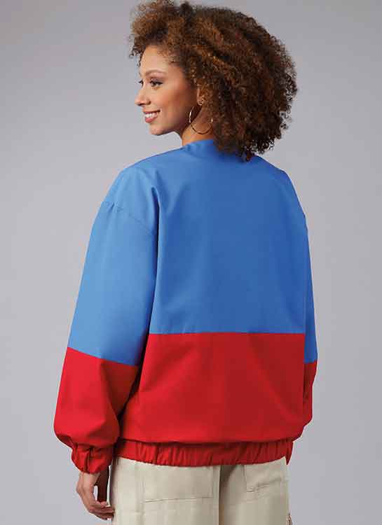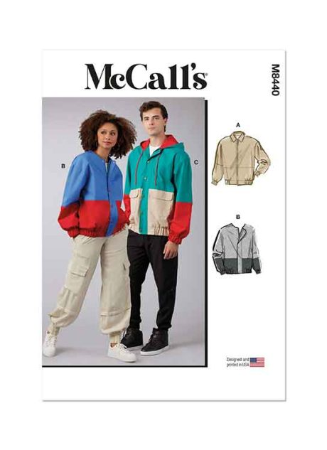 Unisex jacket in sizes X-Small through XX-Large. Jacket in three styles has dropped shoulders, long elasticized sleeves, front zipper closure and pockets. Views B and C have contrast and front flap with jean snaps. View C has a hood. Nylon, Ripstop, Twill. Lining: Lining Fabrics. Interfacing: Lightweight Fusible. Sewing level: AVERAGE.