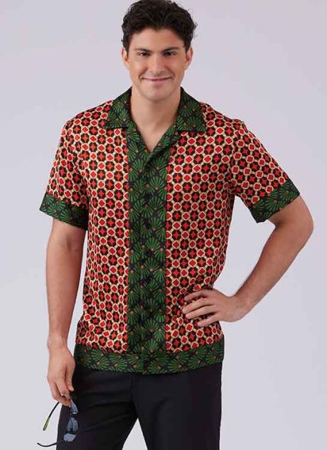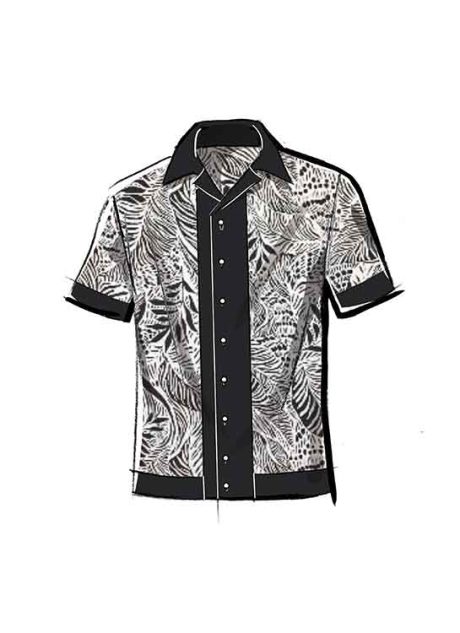 Fitted bowling shirts have notched collar, short sleeves with sleeve bands and front button closing. Views A and C have contrast. Sewing level: Average.
