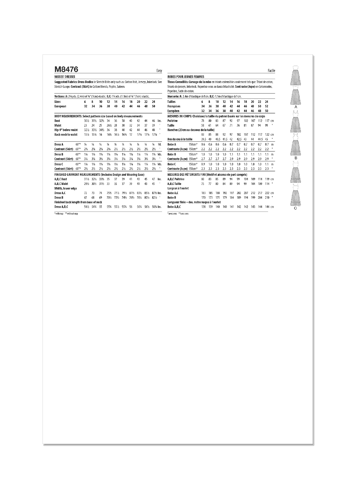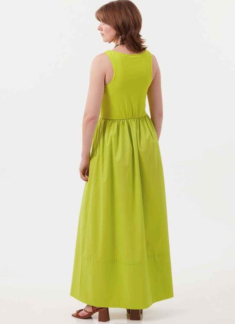 Easy to sew knit bodice dresses with contrast skirts in sizes 6-24. Ankle length dresses have neckline variations, elastic at waist, and side pockets. Dress Bodice in Stretch Knits only such as: Cotton Knit, Jerseys, Interlock. See Stretch Gauge. Contrast (Skirt) in Cotton Blends, Poplin, Sateen. Sewing level: Easy.