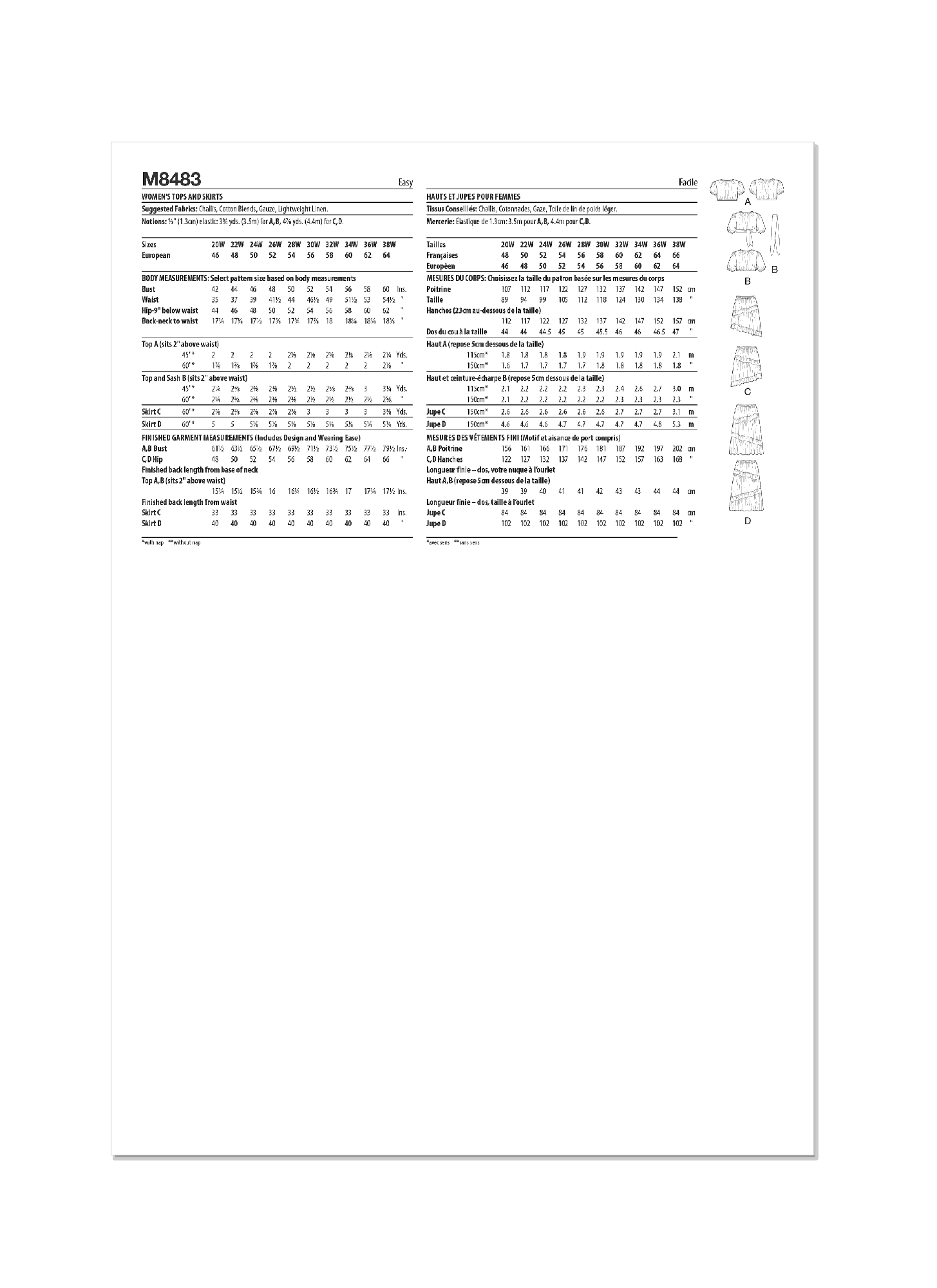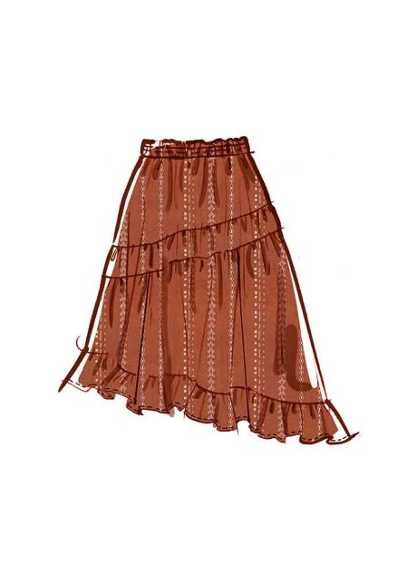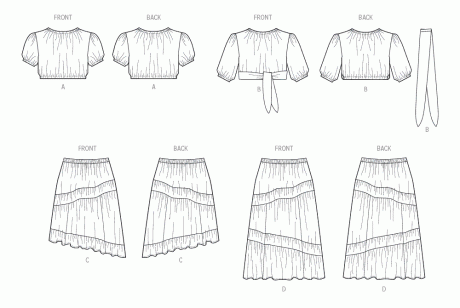 Crop top has short or long puff sleeves and high neckline with elastic at sleeves, waist and neck. View B top includes a sash. Pull on asymmetric tiered skirt comes in two lengths. Challis, Cotton Blends, Gauze, Lightweight Linen. Sewing level: Easy.