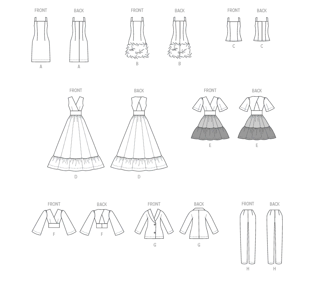 Easy mix and match clothing pieces for 11.5″ dolls. Pattern includes dresses, tops, pants and blazer. A,B,C,D,E,F,G,H: Challis, Charmeuse, Cotton/Cotton Blends, Novelty Satin/Sateen. Sewing level: Average.
