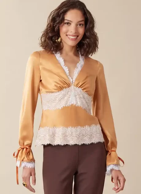 Bias cut pullover tops have sleeve variations, deep v neckline with gathers above bust, invisible side zipper and narrow hems. Views A and C have scalloped lace trim on neckline and bodice. View C top has long sleeves with ribbon ties at the wrist. Fabric suggestions: Challis, Charmeuse, Crepe de Chine, Georgette. Interfacing: Lightweight Fusible. Sewing level: Average.