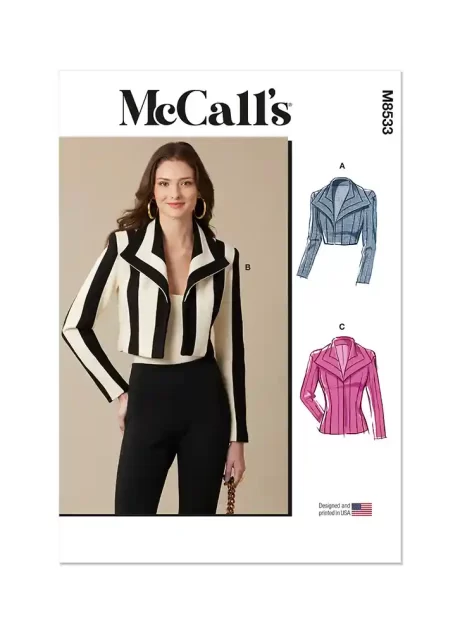 Trendy boleros and jacket with seaming details have wide collar and shoulder pads. View B bolero has contrast. Views A and B have open front, View C has sew-on snaps closures. Fabric suggestions: Cotton Blends, Denim, Velveteen, Wool Blends. Lining: Lining Fabrics. Interfacing: Lightweight Fusible. Sewing level: Average.