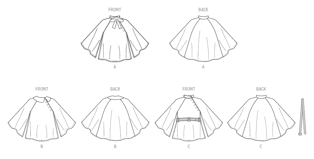 Create these cute and stylish capes in sizes 3-14. Capes have long sleeves, side front button openings, and narrow hems. View A cape has a tie neck. View B has peter pan collar. View C cape has stand collar and contrast belt.