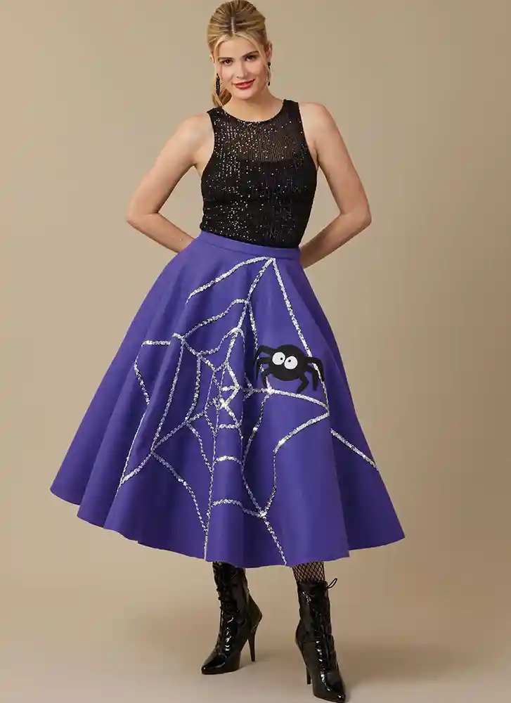 Fun seasonal circle skirts have waistband with side zipper and hook and eye closure. Appliques include snowflake, spider, hearts and Christmas lights. Trims are used for the falling snowflake, snowy hemline, spider’s web and electrical cord for the lights. Fabric suggestions: A,B,C,D and Appliques: Felt. Sewing level: Easy.