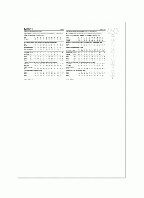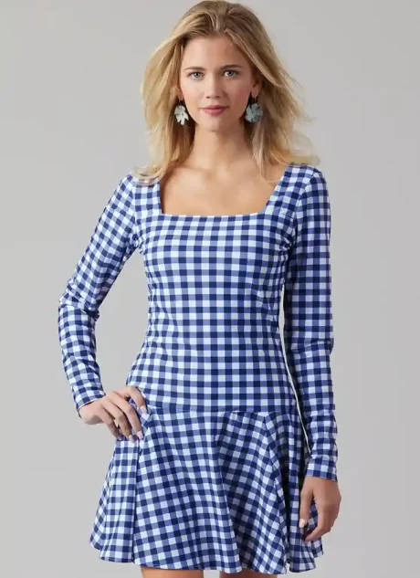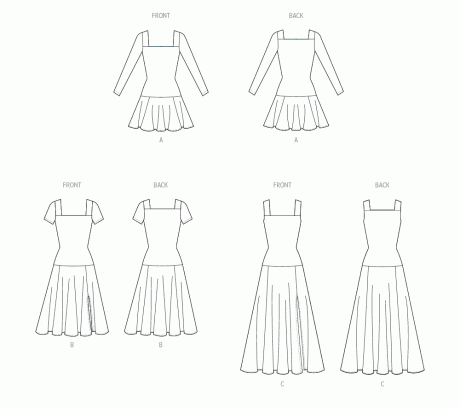 Knit dresses have fitted bodice, flare skirt, square neckline, sleeve and length variations. View A mini length dress has long sleeves. View B dress has short sleeves, open skirt slit and mid-calf length. View C has shoulder straps, open skirt slit and ankle length. Stretch Knits only such as Cotton Knits, Interlock, Jerseys. See Stretch Gauge. Lining: Tricot. Interfacing: Lightweight Fusible. Sewing level: Average.