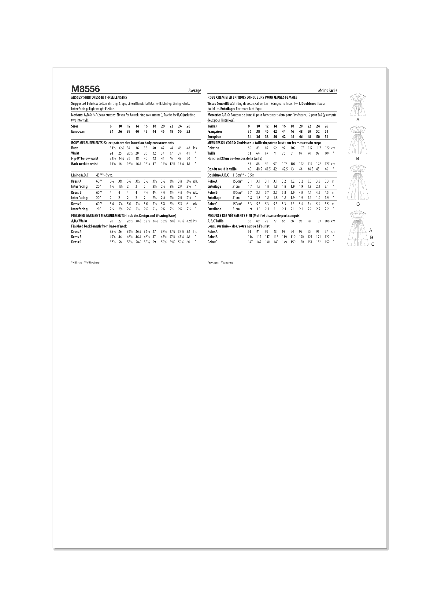 Button front dress, close fitting at waist, has notch collar, short cuffed sleeves with buttoned tabs, full skirt with side seam pockets, baby hem and length variations. Cotton Shirting, Crepe, Linen Blends, Taffeta, Twill. Lining: Lining Fabric. Interfacing: Lightweight Fusible. Sewing level: Average.