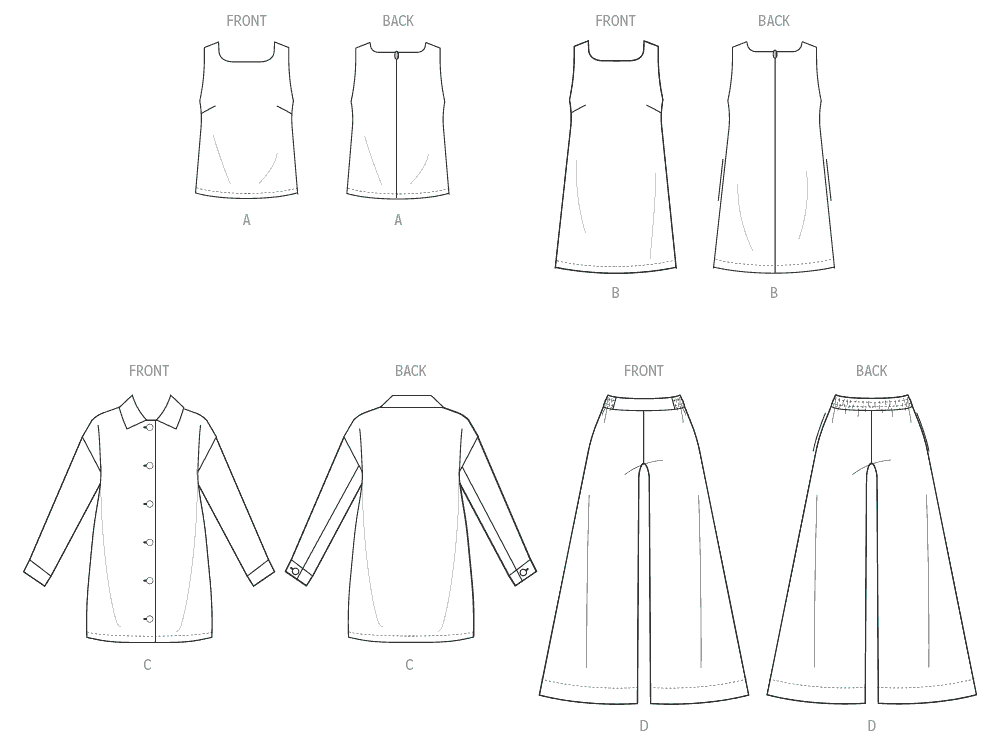 Sleeveless top and dress have square neckline, bust darts, topstitched hem and invisible back zipper closure. Wide leg pants have elastic waistband. Jacket with front button opening has collar, dropped shoulders, long sleeves with button cuffs. Views B, C, and D have side pockets Cotton Blends, Denim, Linen, Poplin. Interfacing: Lightweight Fusible. Sewing level: Easy.