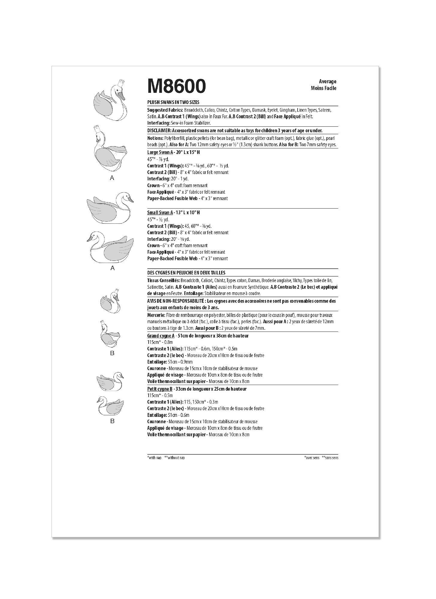 Large 20″ (51cm) long by 15″ (38cm) high and small 13″ (33cm) long by 10″(26cm) high swans have safety eyes, felt bills and bill trim appliques and inner bean bags for stability. All swans have lightly padded and stuffed contrast wings and optional crown and beaded necklace accessories. Accessorized swans not suitable for use as toys for small children. See envelope for more information. Fabric suggestion: Broadcloth, Calico, Chintz, Cotton Types, Damask, Eyelet, Gingham, Linen Types, Sateen, Satin. A,B Contrast 1 (Wings) also in Faux Fur. A,B Contrast 2 (Bill) and Face Applique in Felt. Interfacing: Sew-in foam stabilizer. Sewing level: AVERAGE.