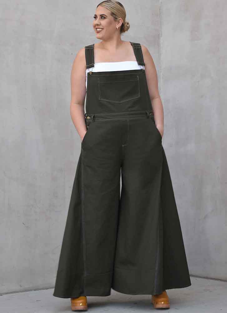 A modern take on the classic, this overall feature a flare leg with side panel, kangaroo pocket detail, mock fly front and adjustable straps. View B has contrast at front pocket and side panel (only variation from view A). Sewing level: Average. Chambray, Corduroy, Cotton Blends, Denim, Linen Blends, Twill. Interfacing:
