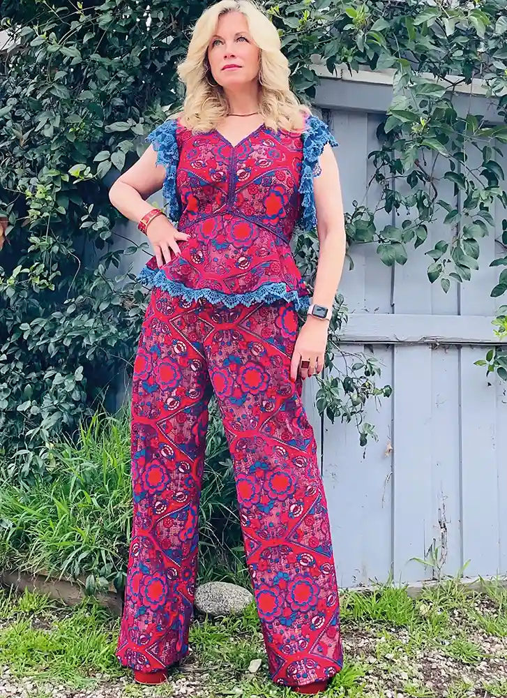 Create this cute lace set for Misses’ size 8-26. Peplum top has purchased gathered lace trim on sleeves and hem, purchased trim at neckline and waist and back invisible zipper. Floor length pants have back darts and side seam invisible zipper closure. Lace, Novelty Lace. Lining: Cotton Blends, Polyester Blends. Interfacing: Lightweight Fusible.