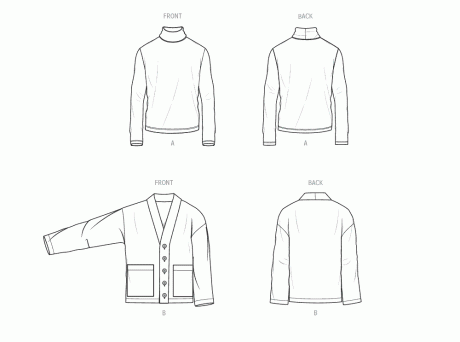 Stylish and soft turtleneck has roll neck and long sleeves. Oversized cardigan has dropped shoulders, neck band, front button opening and patch pockets. Fabric suggestions: A in Stretch Knits only such as: Interlock, ITY, Jersey, Rib Knit, Spandex Blends. See Stretch Gauge. B in Double Knit, Ponte, Sweater Knits, Sweatshirt Fleece, Terry Knit.. Sewing rating: Easy. Norris Danta Ford