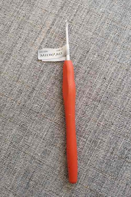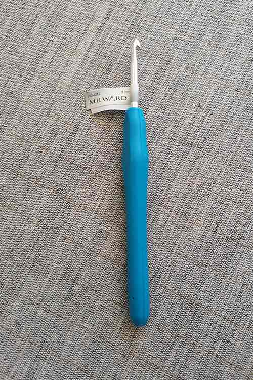 Milward 14cm crochet hooks. 100% aluminium crochet hooks with colour-coded, soft grip rubber handle. Sizes listed in millimetres, 2mm – 6mm.
