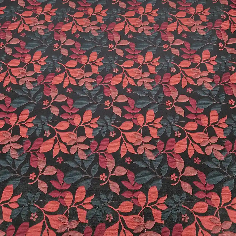 Sophisticated jacquard with raised woven design featuring bottle green and cranberry red leaves on a matt black background. Versatile special occasion fabric, suitable for dresses, suits, and other tailored garments. Width 148cm. Composition: 87% polyester, 13% cotton
