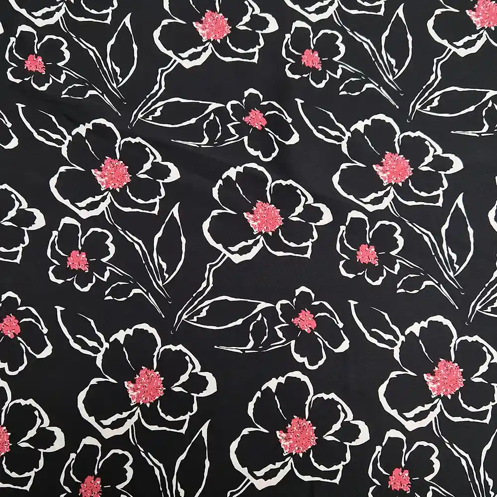 Light and floaty polyester crepe with pink/white floral print on black background. Would make up well as a blouse, dress or full skirt. Width 150cm. Composition: 100% polyester