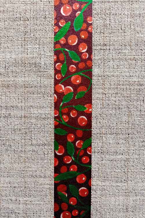 Soft satin Christmas ribbon, red berries and green leaves on a wine coloured background. Perfect for wrapping gifts or Christmas craft projects. 25mm width.