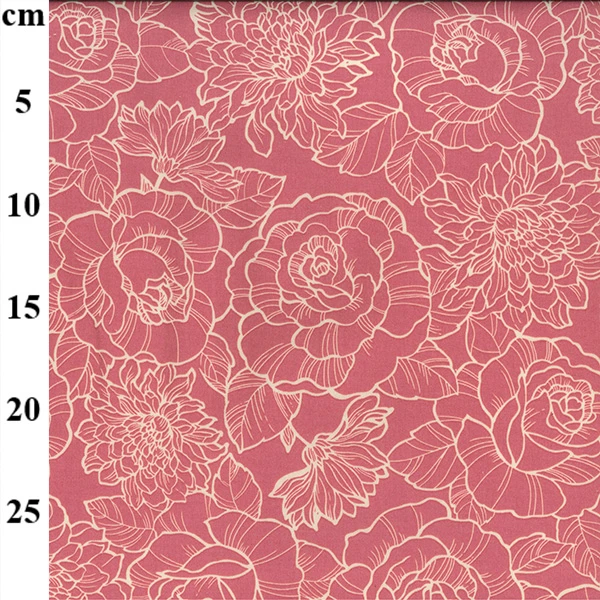 100% cotton poplin with a floral print in ivory on a soft rose pink background. With a soft, smooth handle and great drape this fabric is ideal for quilting, craft and clothing applications. 110cm wide. 130gsm. Oeko-Tex Standard 100 certified. Also available in sage green.