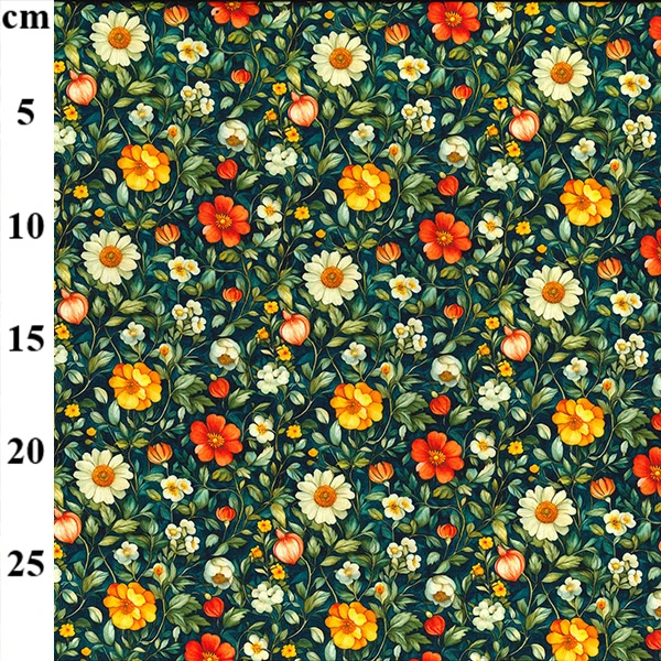 Rose & Hubble’s fantastic cotton poplin featuring a carpet of garden flowers in soft cream, red, and yellow, on a bottle green background. With a soft, smooth handle and great drape this fabric is ideal for quilting, craft and clothing applications. 110cm wide. 130gsm. Oeko-Tex Standard 100 certified.