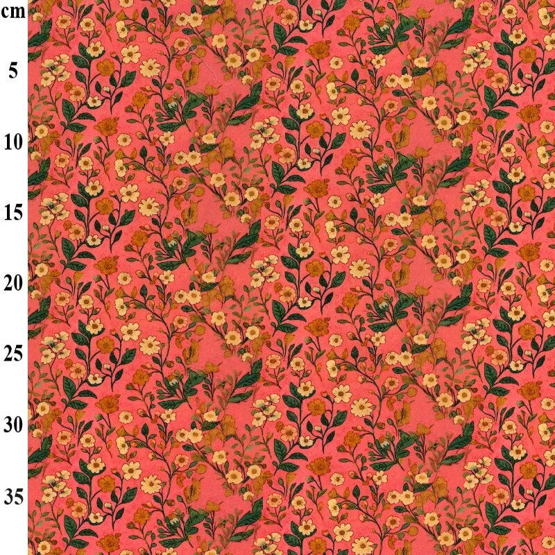Rose & Hubble’s fantastic cotton poplin featuring small yellow flowers on a deep, salmon pink background. With a soft, smooth handle and great drape this fabric is ideal for quilting, craft and clothing applications. 110cm wide. 130gsm. Oeko-Tex Standard 100 certified.