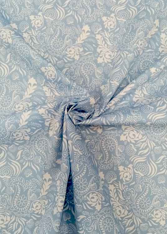 Rose & Hubble’s fantastic cotton poplin with a classic paisley-like pattern in monochrome pale blue and white. With a soft, smooth handle and great drape this fabric is ideal for quilting, craft and clothing applications. 110cm wide. 130gsm. Oeko-Tex Standard 100 certified. Also available in pink.