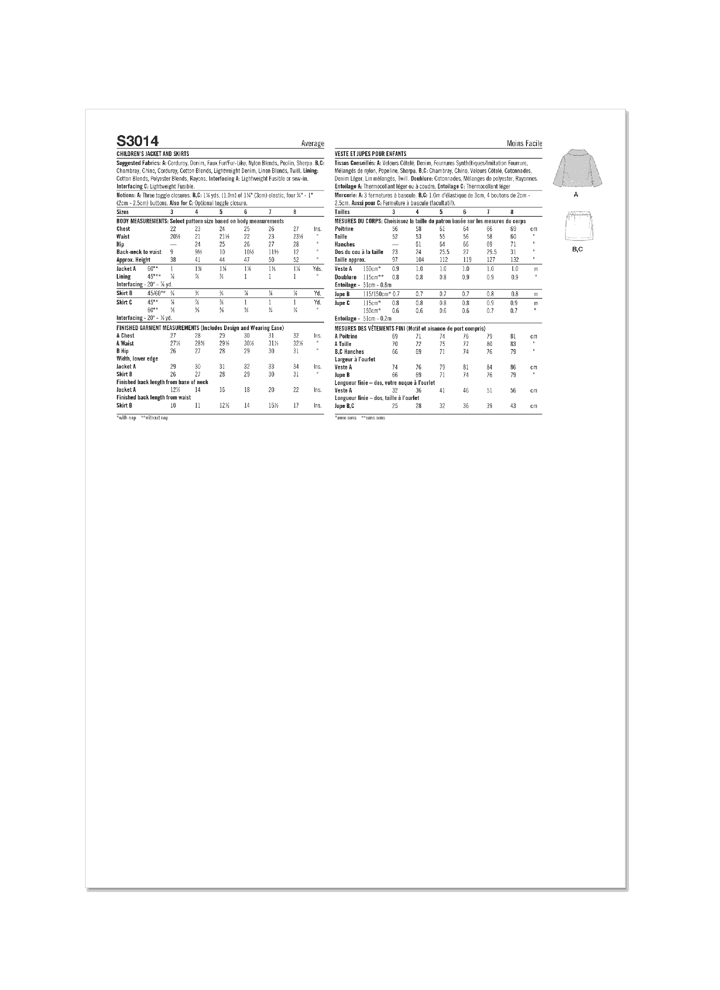 Relaxed fit jacket has front toggle closure, shaped collar, and side seam pockets. Pull-on skirts have elastic waistband, side seam pockets and front button detail. View C has front patch pocket with flap and optional toggle closure. A: Corduroy, Denim, Faux Fur/Fur-Like, Nylon Blends, Poplin, Sherpa. B,C: Chambray, Chino, Corduroy, Cotton Blends, Lightweight Denim, Linen Blends, Twill. Lining: Cotton Blends, Polyester Blends, Rayons. Interfacing A: Lightweight Fusible or sew-in. Interfacing C: Lightweight Fusible. AVERAGE.